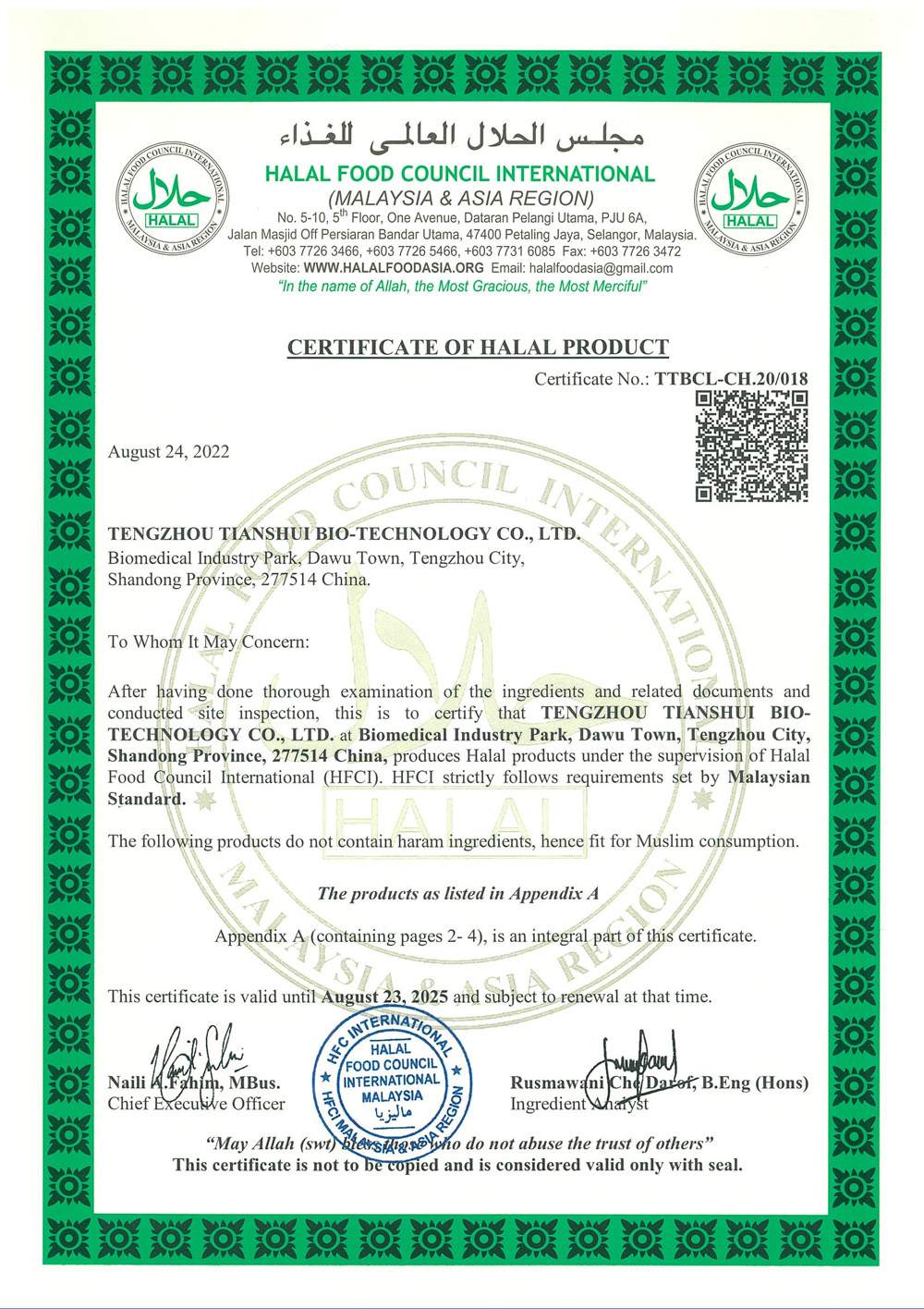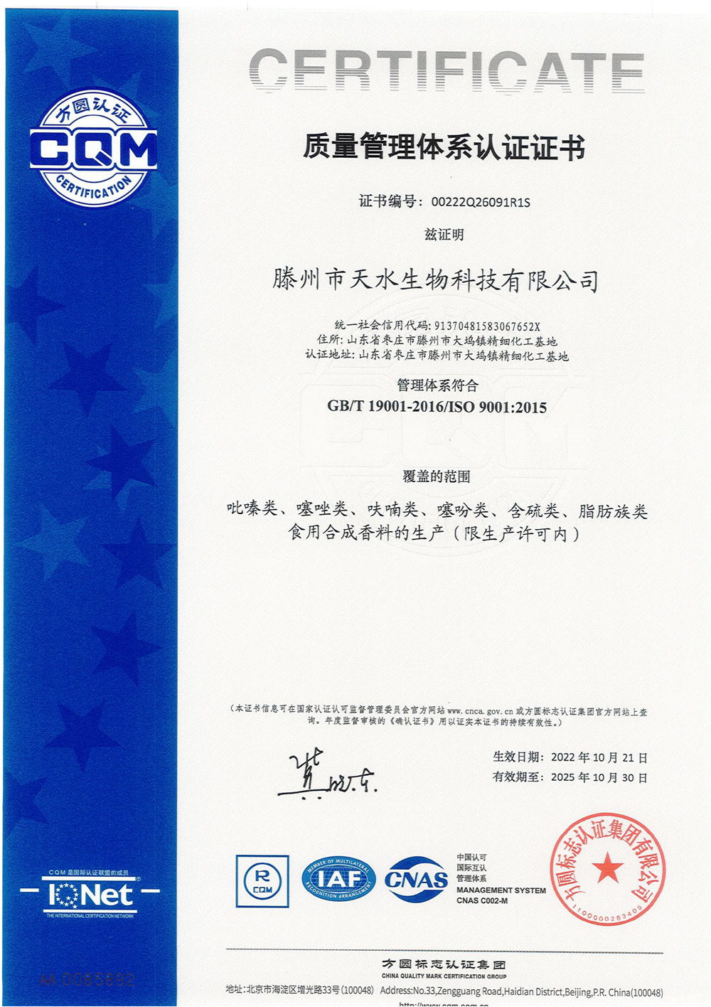 滕州市天水生物科技有限公司成立于2011年9月,是目前國(guó)內(nèi)雜環(huán)類合成食品香料、日化香料和醫(yī)藥中間體生產(chǎn)經(jīng)營(yíng)的綜合性企業(yè)。坐落于山東省滕州市生物醫(yī)藥產(chǎn)業(yè)基地,總投資5000余萬(wàn)元,占地面積約30000平方米,員工百余人。公司先后被評(píng)為高新技術(shù)企業(yè)、專精特新中小企業(yè)、科技型中小企業(yè),建有市級(jí)重點(diǎn)實(shí)驗(yàn)室1處,并先后獲得ISO9001質(zhì)量體系認(rèn)證、ISO22000食品安全體系認(rèn)證、kosher認(rèn)證和Halal認(rèn)證。是香精香料及食品配料協(xié)會(huì)會(huì)員單位及滕州市中小企業(yè)協(xié)會(huì)理事單位。